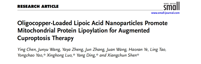 近日,公司沈祥春教授团队联合中国药科大学丁杨教授及四川大学华西医院姚永超副研究员,在国际顶级期刊《Small》(影响因子12.1)上发表了题为“Oligocopper-Loaded Lipoic Acid Nanoparticles Promote Mitochondrial Protein Lipoylation for Augmented Cuproptosis Therapy”的研究论文。该研究成功开发了一种能够促进线粒体DLAT蛋白脂酰化、增强肝癌细胞及三阴性乳腺癌细胞铜死亡效应的寡铜硫辛酸纳米粒(Cu@TcNAs),显示出良好的生物安全性和显著的临床应用潜力。