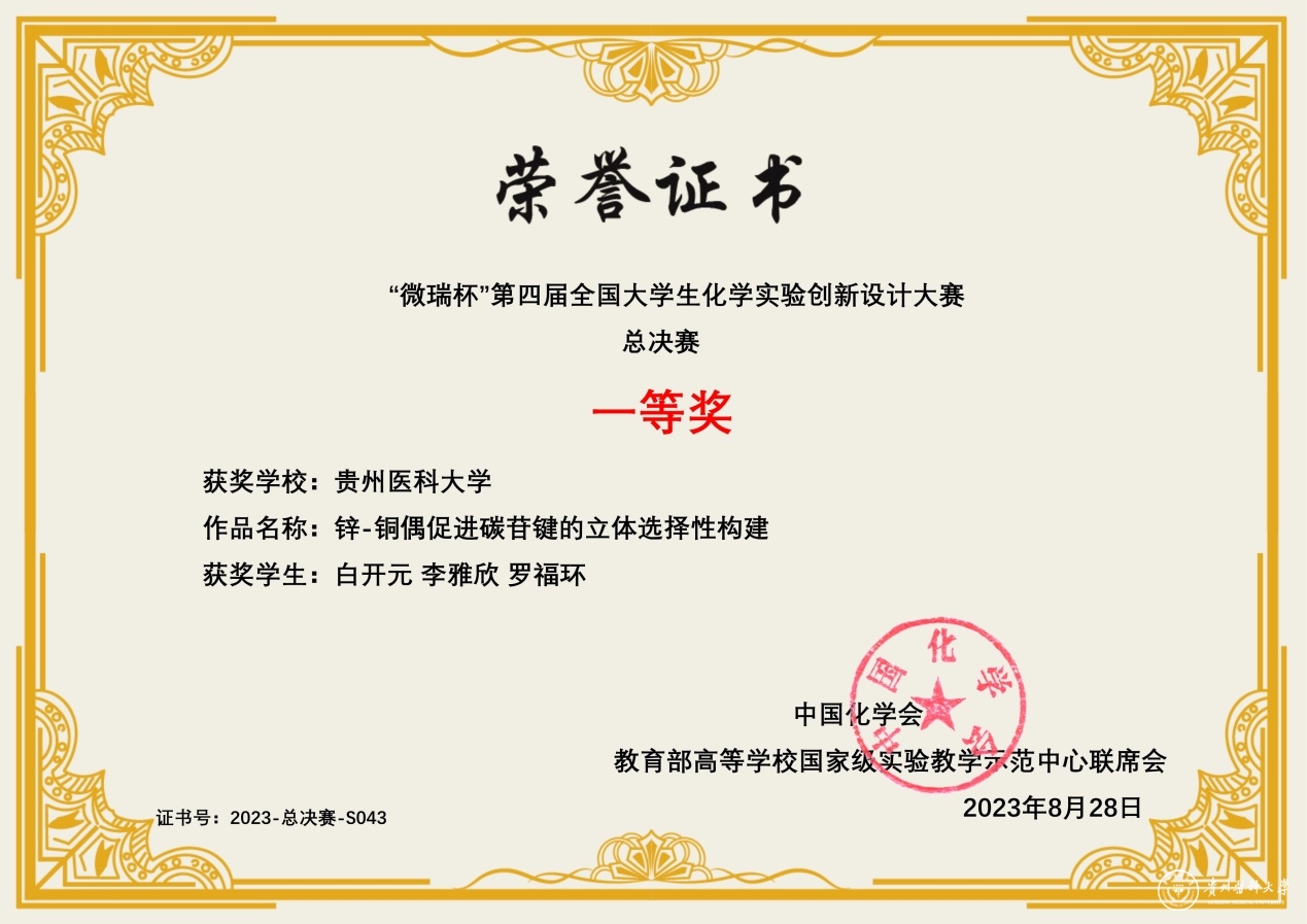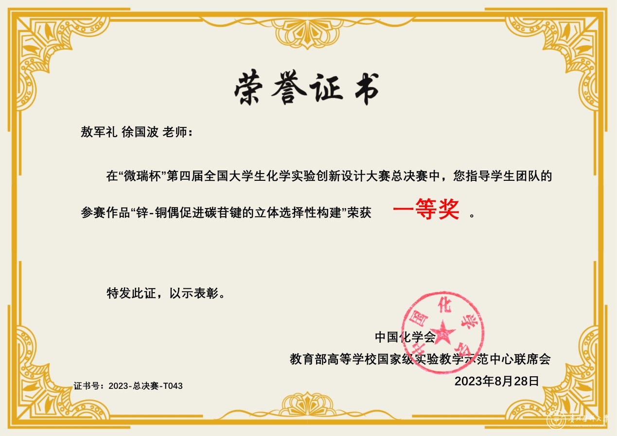 近日,中国化学会和教育部高等公司国家级实验教学示范中心联合主办的“微瑞杯”第四届全国老员工化学实验创新设计大赛总决赛在浙江大学举行。mk体育教师敖军礼和徐国波指导本科生白开元、李雅欣、罗福环的创新实验《锌-铜偶促进碳苷键的立体选择性构建》,获西南赛区一等奖。在西南赛区一等奖的附加赛中再次晋级全国总决赛,在总决赛的激烈角逐中最终斩获全国一等奖。