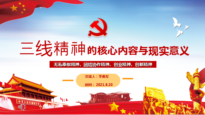 党课由“三线精神的形成和发展”、“三线精神的核心内容”、“三线精神的时代意义”“三线精神与新时代”四个部分组成。三线建设,指的是1964年到1980年,我国中西部地区进行的一场以战备为中心,以国防科技和工业交通为主的大规模基础建设,在建设三线过程中逐步形成了三线精神。 三线建设为拉动落后地区经济和人才提高,同时集中一批产业发展,为新世纪的重大国家战略西部大开发奠定了深厚的工业基础,三线建设为我国留下的物质遗产,至今仍是我国实施西部大开发,推行“一带一路”的基础。