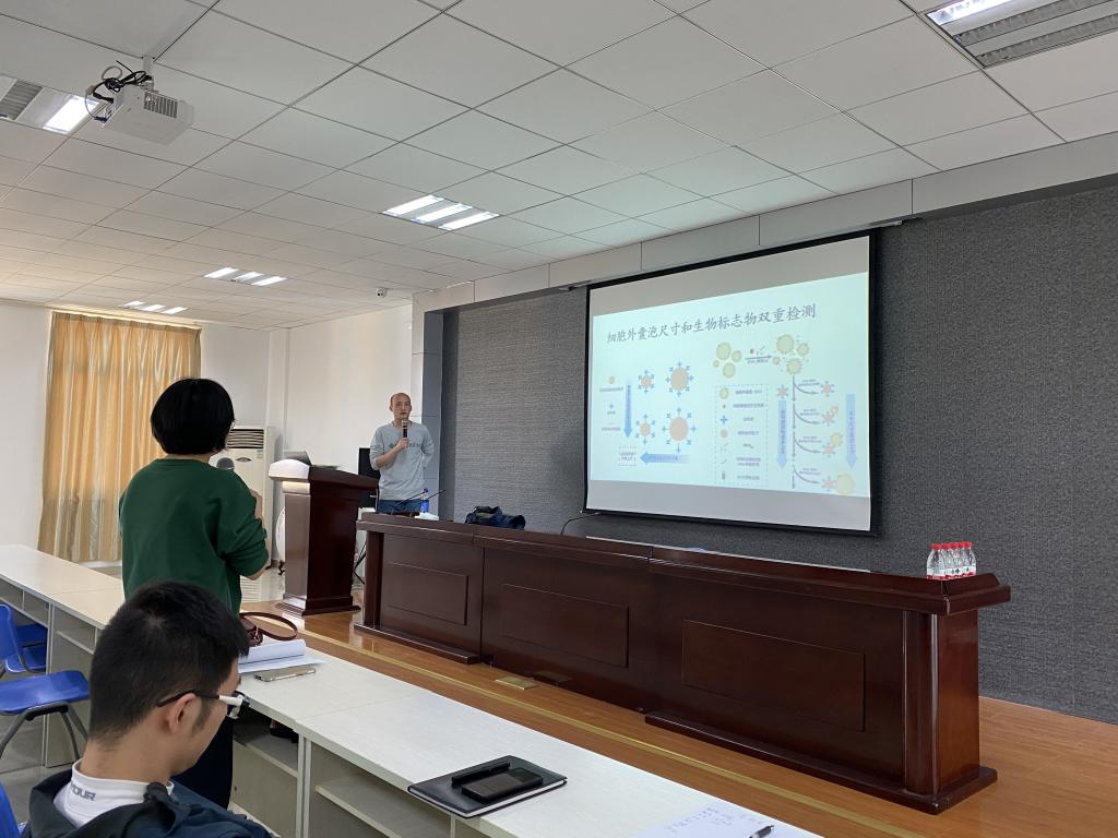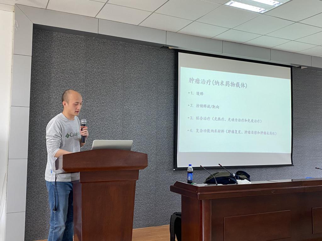 吴兴杰博士就纳米材料在癌症中的应用展开了详细的介绍。目前主要有四种针对肿瘤治疗(纳米药物载体)的方法,分别为:缓释、控制释放/靶向、联合治疗以及复杂功能纳米材料。同时详细讲解了纳米材料在疾病诊断中应用的方法以及便捷性。讲座结束后,参会的老师和同学与吴兴杰博士进行了深入的沟通交流。报告取得圆满成功。