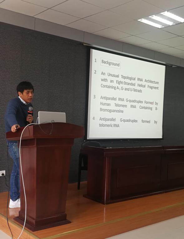 肖潮达博士以“端粒RNA G-四链体的结构解析”为主题,介绍了RNA G-四链体结构解析现状,并以三种结构解析为例进行说明,分别是含有A-,G-和U-四分体的八链螺旋片段的异常拓扑RNA结构,含有8-溴鸟嘌呤的人端粒RNA形成的反平行RNA G-四链体结构和人端粒RNA形成的反平行RNA G-四链体结构。