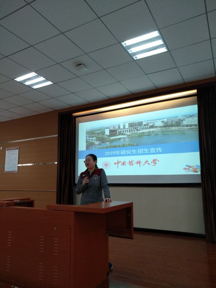 宣讲会于中午1点准时开始,mk体育格物楼5101教室座无虚席。谭宁华教授首先向在座的本科生介绍了中国药科大学简况。她以风趣幽默的语言详细地讲述了中国药科大学的团队建设、科研平台、科研指标、科研奖励和科研平台等内容,鼓励各位研究生心怀梦想,并就同学们关心的研究生奖学金、研究生就业等问题做出了深入的说明。演讲的最后,谭教授重点介绍了2018年优秀老员工暑期夏令营的活动,建议感兴趣的同学通过夏令营活动增进对中国药科大学的了解,以此为契机进入中国药科大学攻读硕士、博士学位。