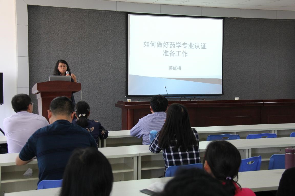 蒋红梅书记结合公司本科教学工作审核评估和临床医学专业、护理专业认证的工作经验,以“如何做好药学专业认证准备工作”为题做专题辅导。